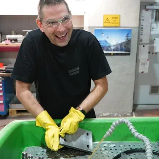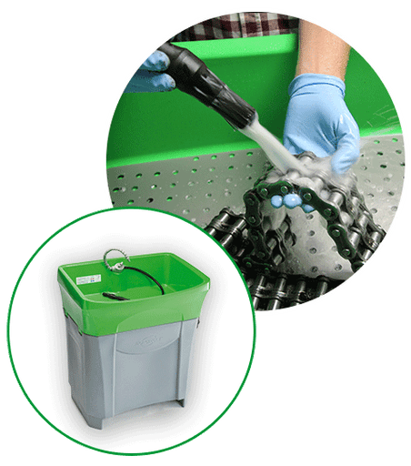 - Aus dem Tank wird der Reiniger in das Reinigungsbecken gepumpt, dort findet die manuelle Reinigung der Bauteile mit einem Waschpinsel statt.