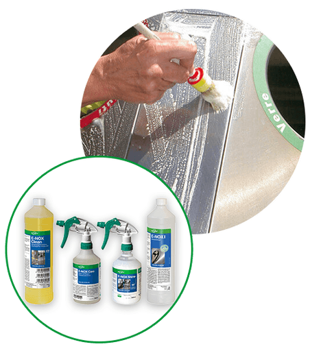 Die E-NOX Produkte erhalten den Wert von Metallbauteilen, schützen bei längerer Lagerung und sind für alle Edelstahloberflächen geeignet, einschliesslich V2A und V4A. Für Innen- und Aussenanwendung geeignet.